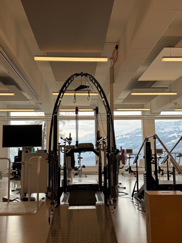 An anderer Ecke, im Panorama, im Trainingssaal mit den vielen Geräten, da ist es noch schlimmer. Sie hängen in den Geräten. Schnaufen. Entspannen, warten, dass die Zeit vorbei geht. Bewegen sich ein bisschen. Nennen das Studio “Folterkammer“. Ich möchte es Heilungsraum nennen. Mache mehr Wiederholungen, mehr Gewicht. Ich zahle dafür, alles tut mir weh, nicht nur mein zerschmettertes Bein. Aber es lohnt sich auch. Meine Schultern sehen aus wie früher. Ich flitze mit dem Rolly und quietsche: „Let’s go Paralympics!“ Leider findet das kaum jemand amüsant. Ich nerve die, die sich verbündet haben mit dem Schweinehund. Ich meide ihn wie meinen grössten Feind. Es kostet alles. Vor allem Kraft.