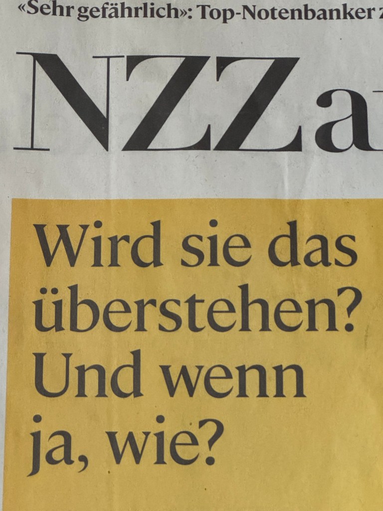 Nach acht Monaten kam ich zurück in mein Domizil, das ich im Sommer verlassen hatte. Ich war damals zum Umpacken kurz dort gewesen für zwei Tage und hatte die Sonntags NZZ gelesen. Sie war durchgelesen und trotzdem entsorgte ich sie nicht, liess sie auf einem Sessel liegen. Mir gefiel das Wortspiel, das als Titel dick gedruckt war… schau selbst…